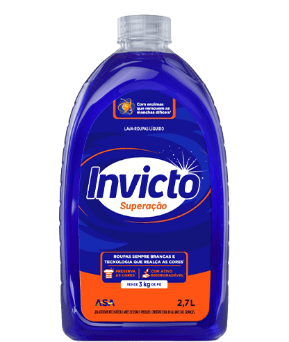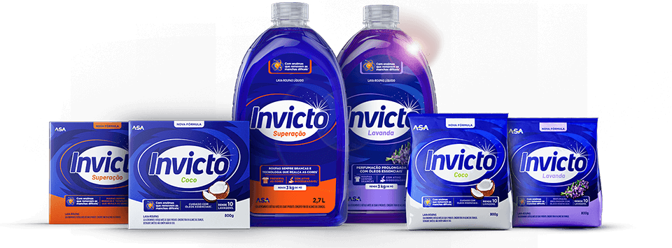 Invicto é uma marca de produtos de limpeza com soluções inovadoras que fazem a diferença na sua rotina. Seja para cuidar das suas roupas ou da sua casa, Invicto é sempre a escolha mais prática e eficiente. São 7 linhas de produtos desenvolvidas com alta performance para superar pequenos e grandes desafios do dia a dia, garantindo eficiência em cada uso. Nossos produtos vão além da limpeza: eles oferecem cuidado, praticidade e aquele toque especial de fragrância que transforma o ambiente, deixando-o perfumado por mais tempo. Combinando eficiência e originalidade, Invicto é a escolha certa para quem busca uma limpeza impecável, seja na lavanderia ou em qualquer canto da casa.